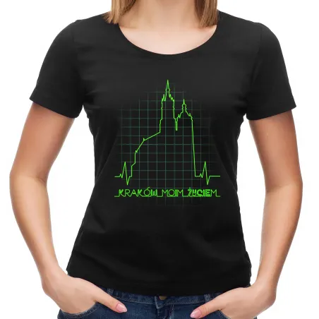 • Wzór: koszulka z napisem "Kraków Moim Życiem”, wykres EKG w kształcie Kościoła Mariackiego