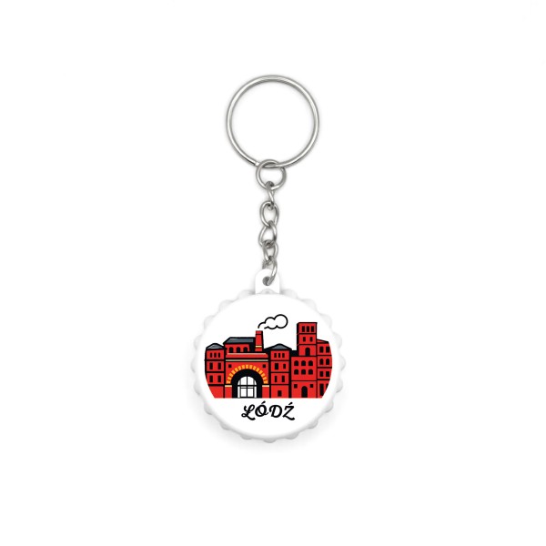 Brelok „Łódź Fabryka” w formie kapsla to stylowa pamiątka z Łodzi, nawiązująca do przemysłowej historii miasta i jego charakterystycznej architektury fabrycznej.