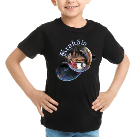 Koszulka z nadrukiem z ulubionego miasta to obowiązkowy zakup dla osób, które uwielbiają podróżować i chcą się tym dzielić z innymi. Może nam służyć zarówno jako pamiątka turystyczna, jak i praktyczna odzież do noszenia na co dzień. Wzór na t-shircie przedstawia odbity w bańce mydlanej krakowski Rynek ze wszystkimi jego najważniejszymi zabytkami i symbolami: Sukiennice, Ratusz, Kościół Mariacki, a także lecący smok, barwna postać Lajkonika i krakowski gołąb.