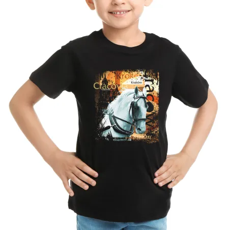 Koszulka z nadrukiem z ulubionego miasta to obowiązkowy zakup dla osób, które uwielbiają podróżować i chcą się tym dzielić z innymi. Może nam służyć zarówno jako pamiątka turystyczna, jak i praktyczna odzież do noszenia na co dzień. Wzór na t-shircie przedstawia konia z krakowskiej dorożki na tle rysowanego Kościoła Mariackiego z napisami Kraków w kilku językach - Cracowia, Krakau, Cracow, Cracovie, Kroke.